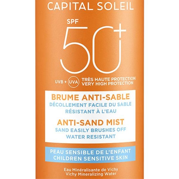CAPITAL SOLEIL Brume Anti-Sable est une haute protection solaire pour enfants et bébés qui permet le décollement du sable.• Indice SPF : 50+ (UVA/UVB)• Besoin : Protection Solaire | Peaux sensibles.• Ingrédients Clés : Eau Thermale Minéralisante de Vichy pour régénérer et fortifier | Système Filtrant au Mexoryl XL pour préserver des UV.• Sécurité : Hypoallergénique | Sans Parabène | Sans Parfum.• Utilisation : Appliquer avant l'exposition. Renouveler fréquemment. Visage et Corps.
